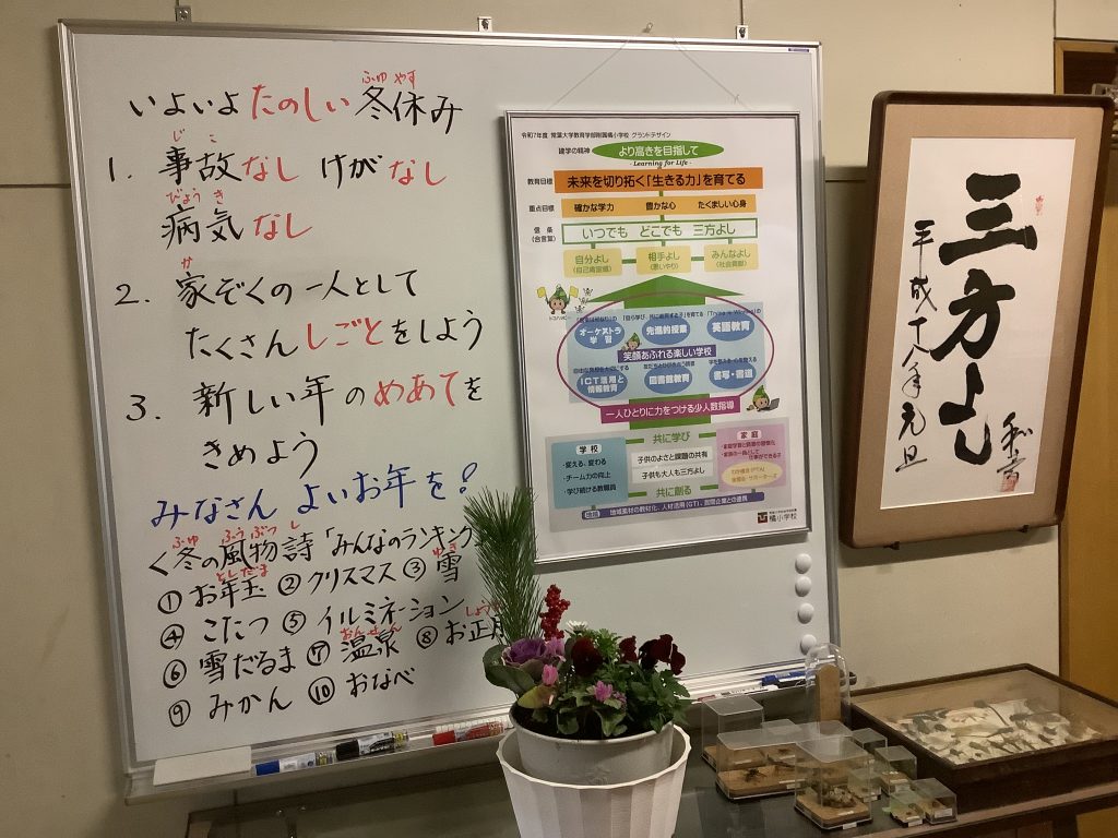 12月19日(金)に年内最後の授業を終えて、子供達は冬休みに入りました。この日には、多くのコンクールの表彰と冬休みのくらしについて、そして校長先生からのお話がありました。冬休みにしかできないたくさんの経験をして、また新年会えることを楽しみにしています。みなさまもよい年をお迎えください。